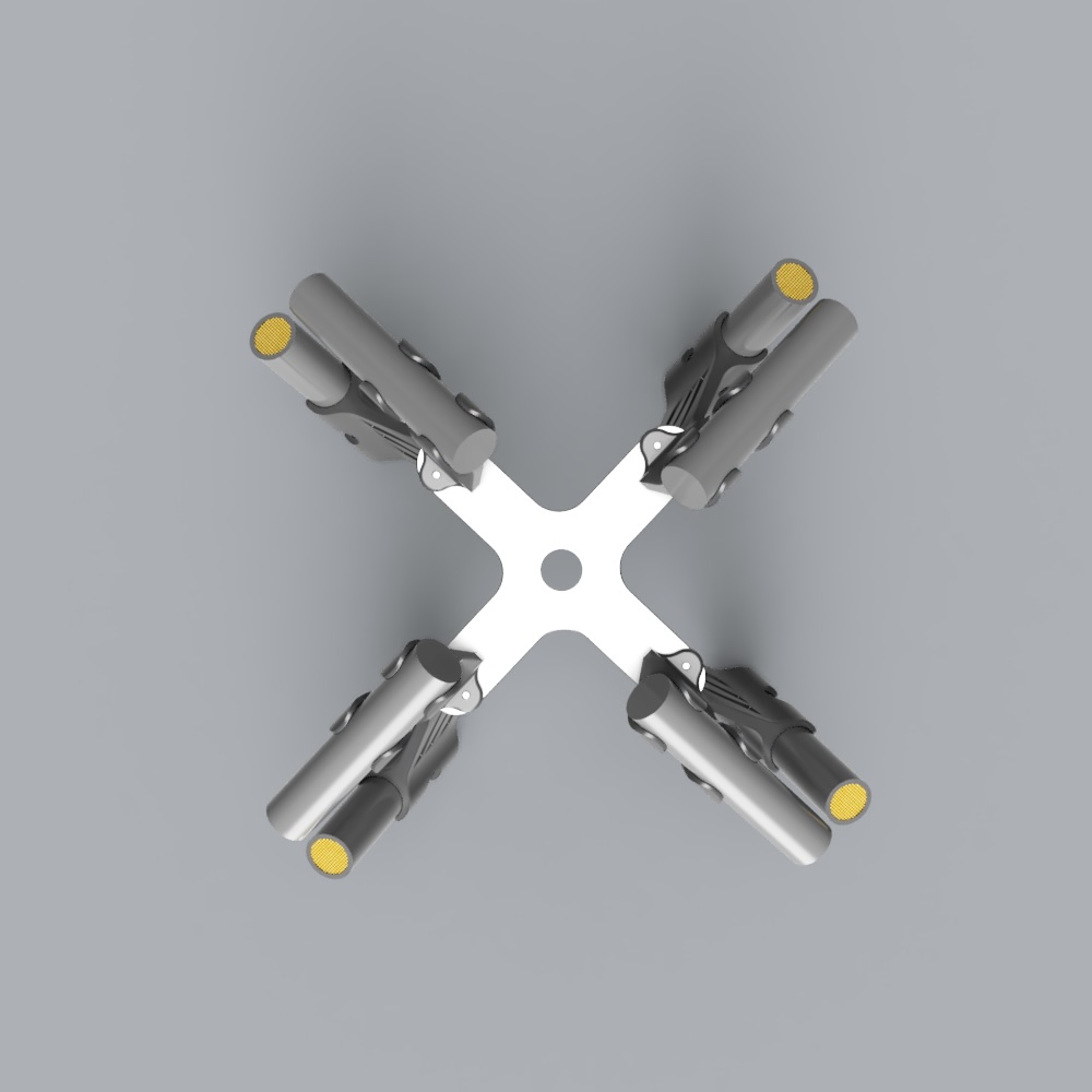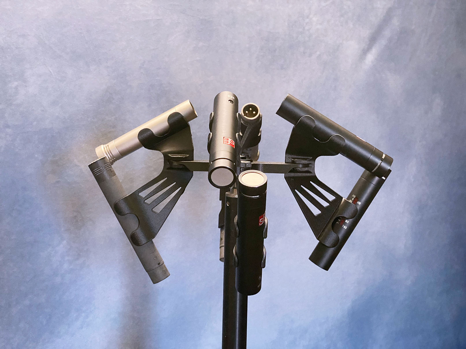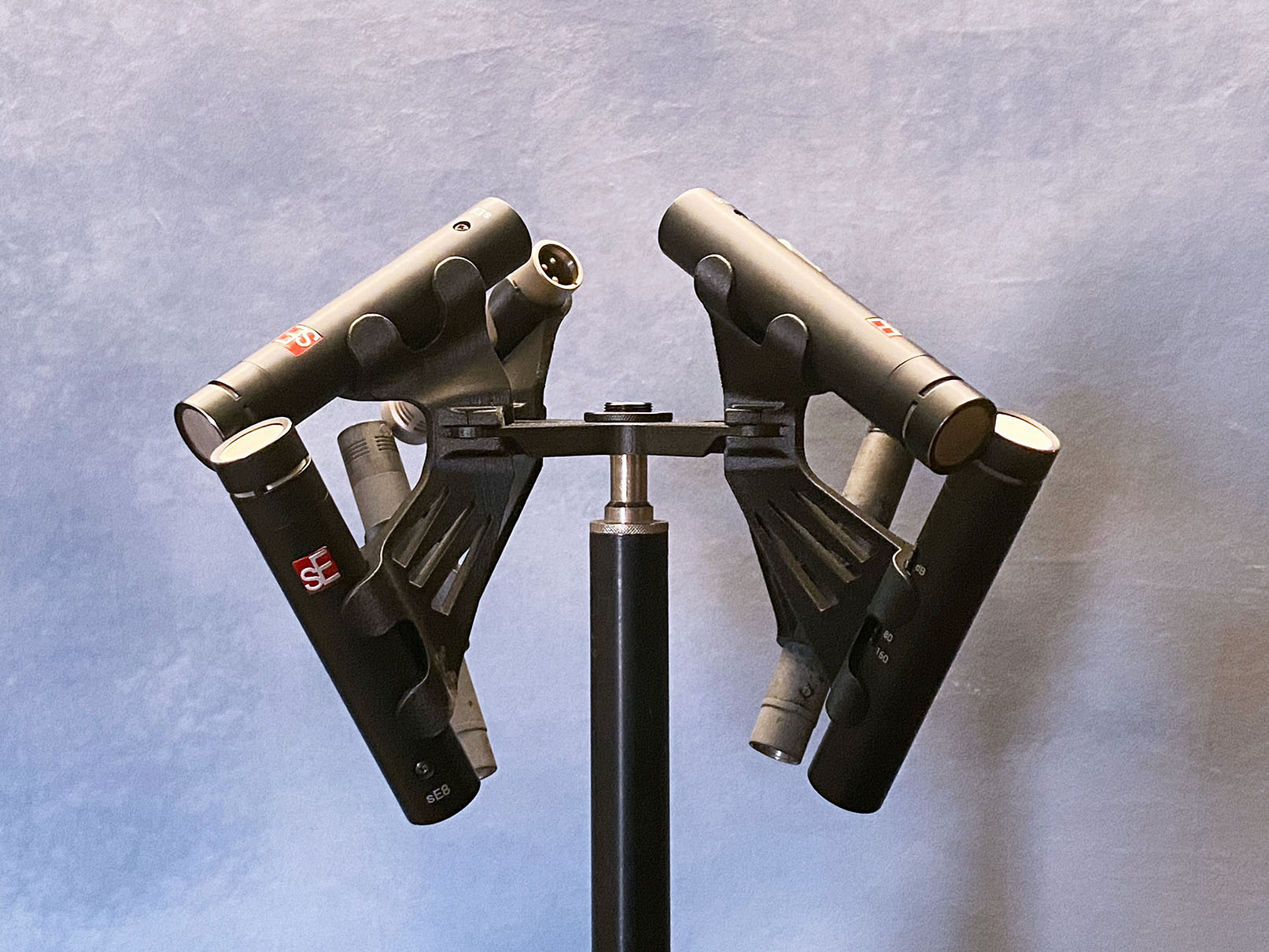 This 8-microphone mount allows easy configuration of an ORTF Cross surround array combined with a matching coincident Z channel array. This 3-D microphone technique ensures phase coherence between low and high channels. The 17cm microphone spacing on the horizontal plane allows a good blend of perceived spaciousness and phase conference, while the 0mm spacing between upper and lower mic arrays offers perfect phase coherence between high and low channels.